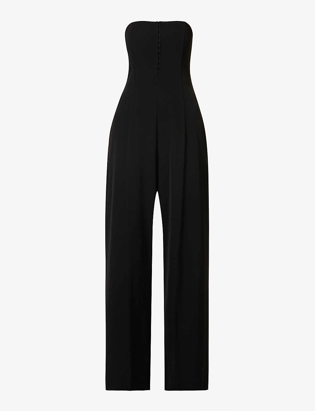 - Regular-fit, straight-across neck, strapless, structured boning at bodice, two slip pockets at front, wide leg, two jet pockets at back, partially lined