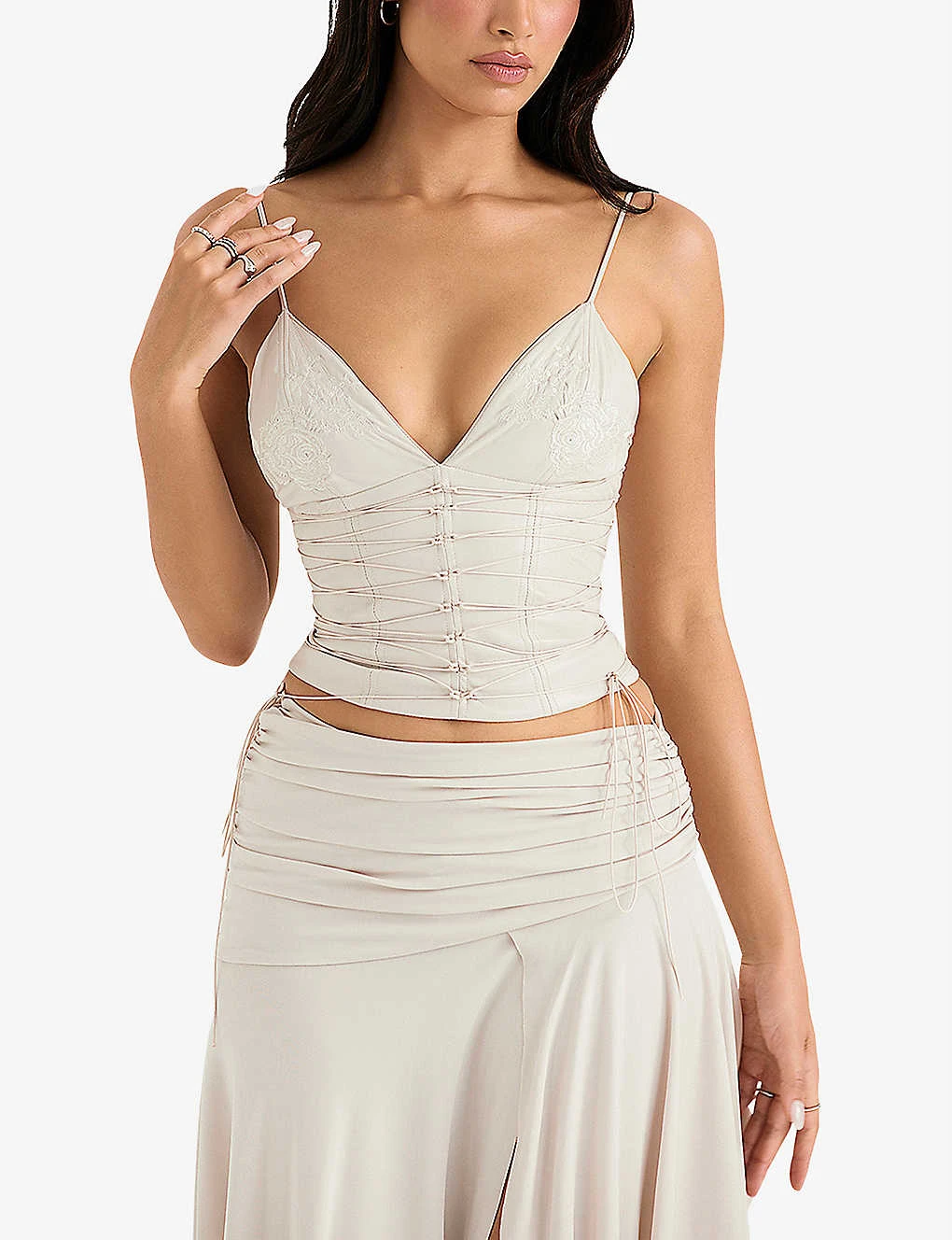 - Deep V-neck, spaghetti straps, sleeveless, strappy details across the bodice, internal boning