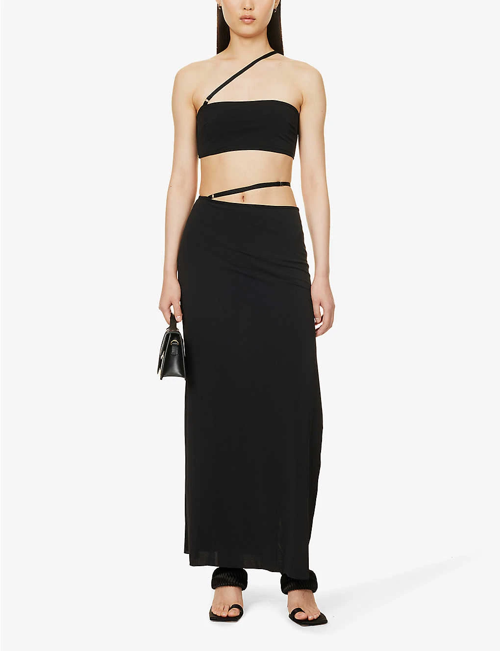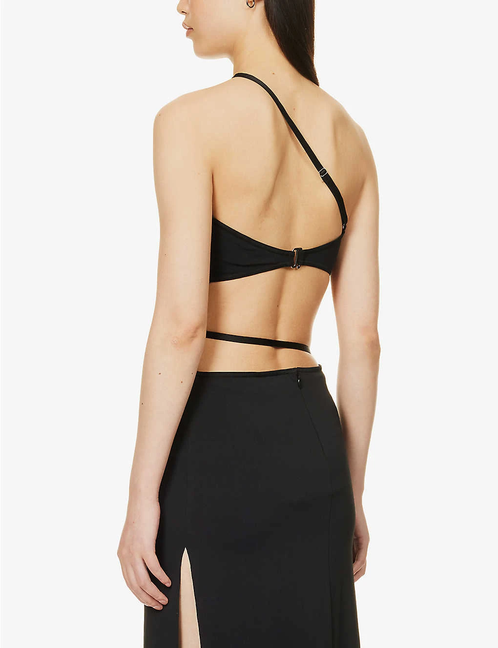 - Slim fit, asymmetric neckline, sleeveless, one shoulder, adjustable straps, darts at chest, cropped