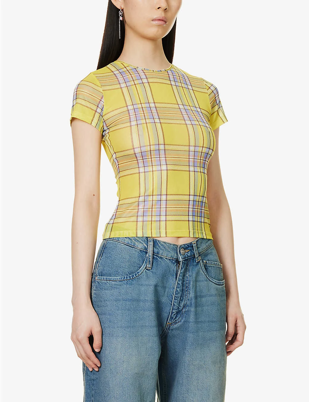 - Slim fit, round neckline, short capped sleeves, all-over check pattern, sheer