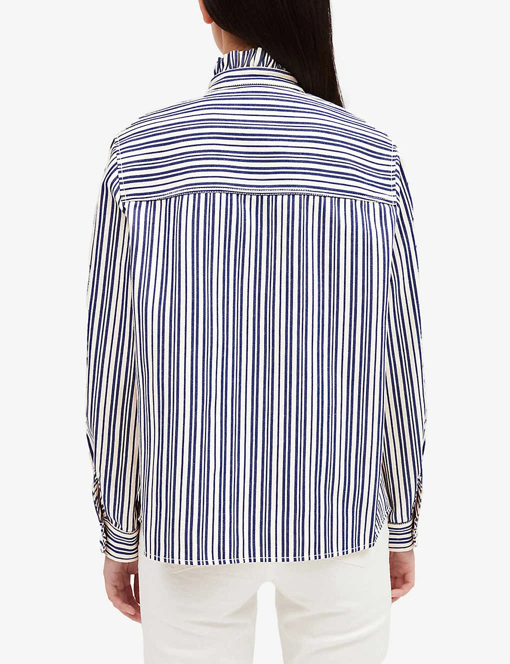 - Ruffle neck, long sleeves, buttoned cuffs, patch pockets at the chest, all-over stripe print
