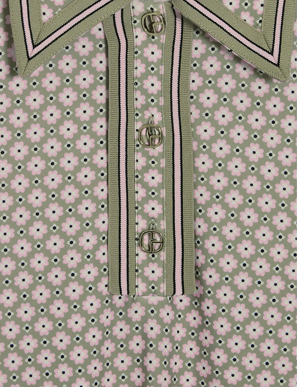 - Collared, button-detail, short sleeves, abstract-print throughout