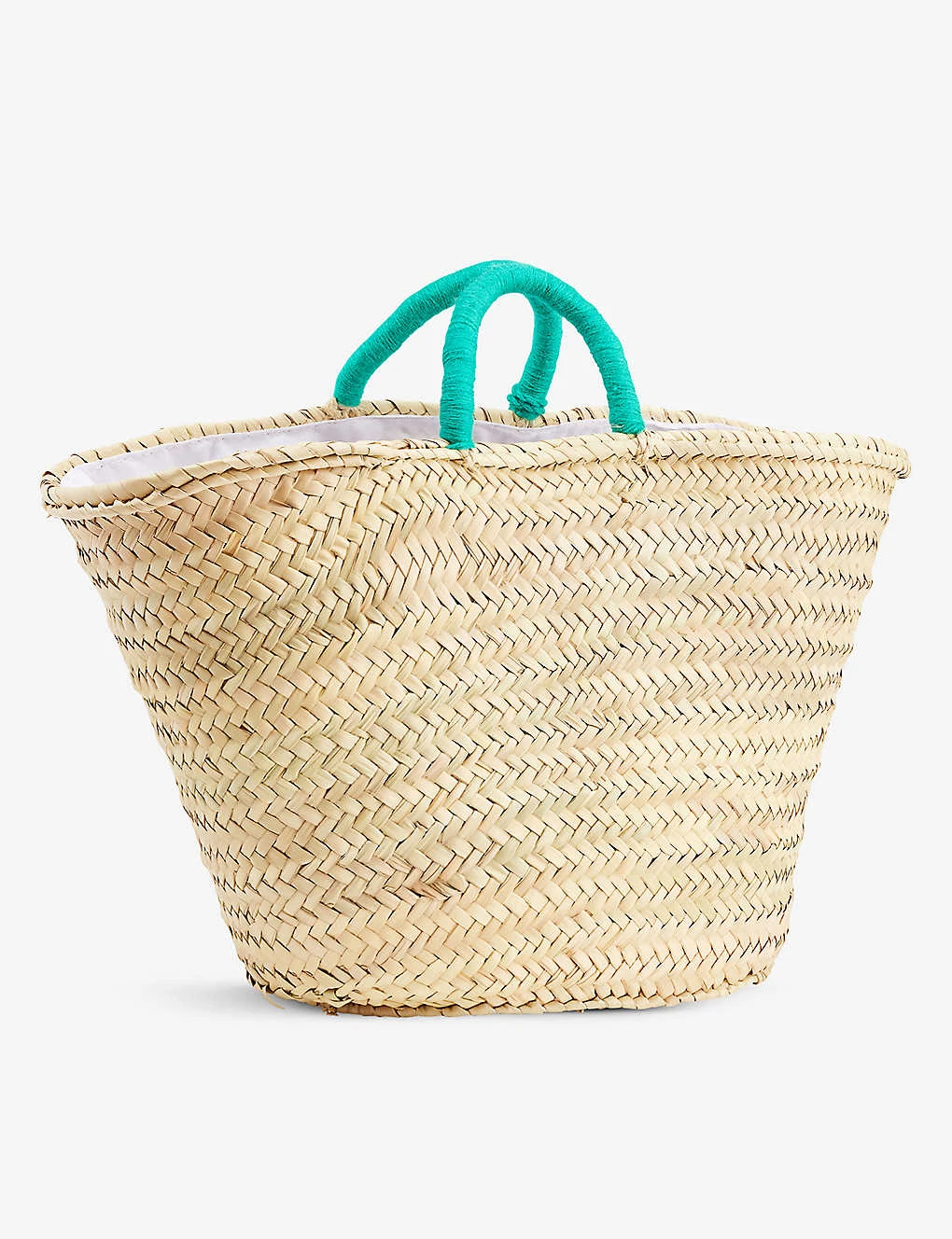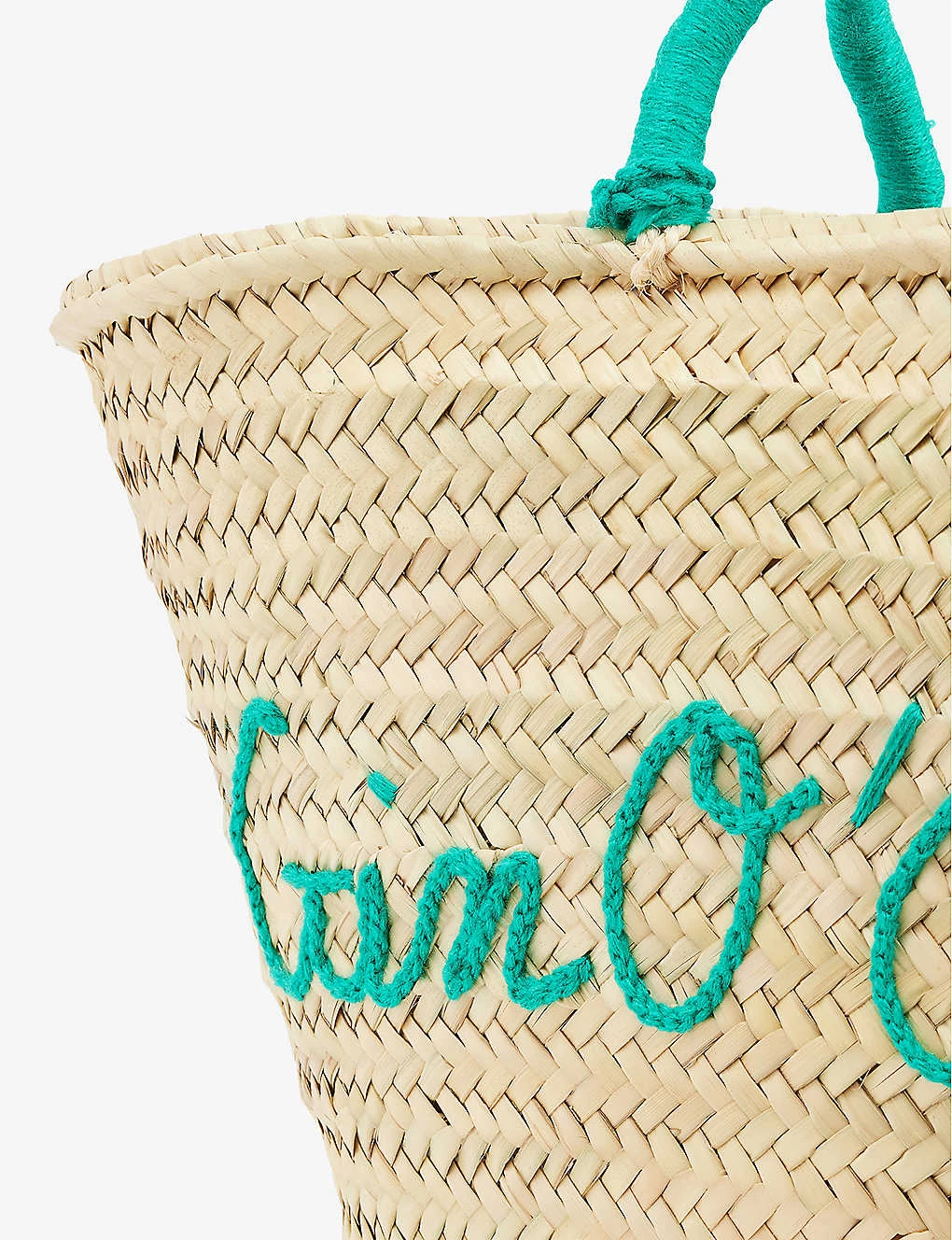 - Basket shape, double top-handles, text embroidery and detachable tassel at front, all over raffia pattern, contrast embellishment, one main compartment, internal brand tab, fully lined