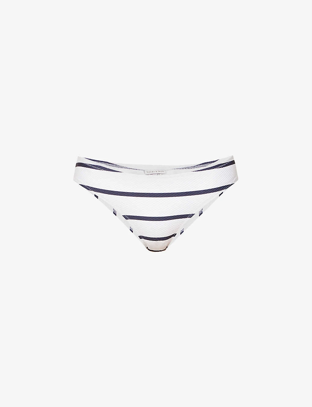- Mid-rise, high leg, branded plaque at back, gold-toned hardware, all-over striped pattern, fully lined