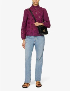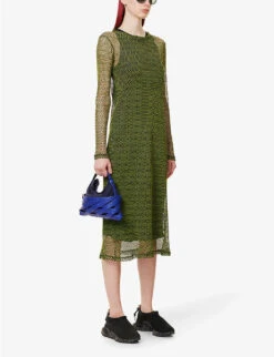 - Regular fit, mid-rise, structured elasticated waistband, abstract pattern, darts at front and back, brand metal plaque at back, flared split hem