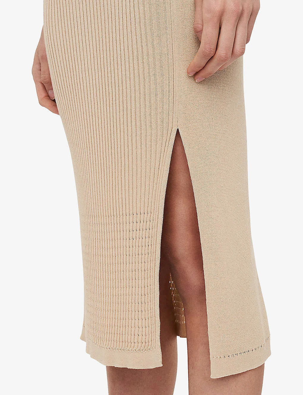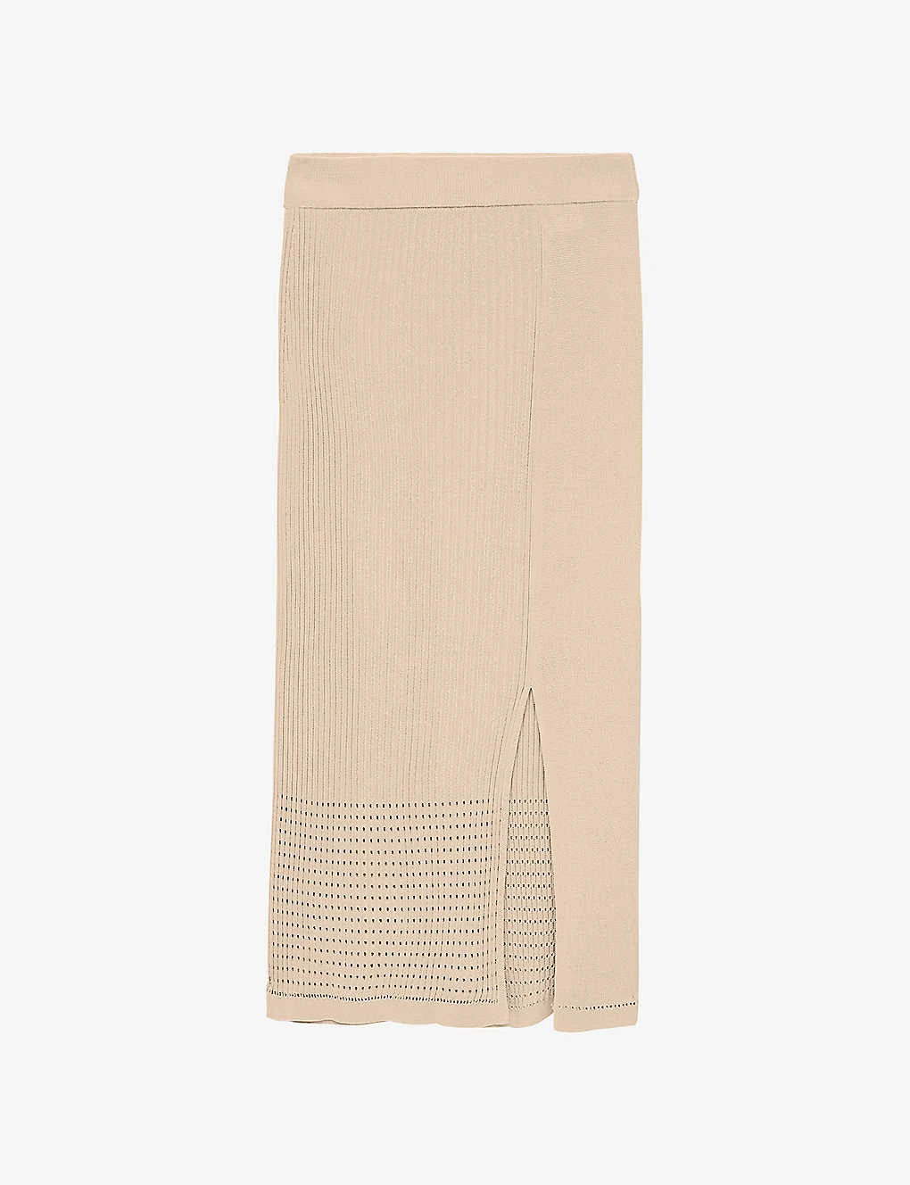 - Slim fit, midi length, mid-rise, all-over ribbed finish, side slit, elasticated waistband, perforated edge