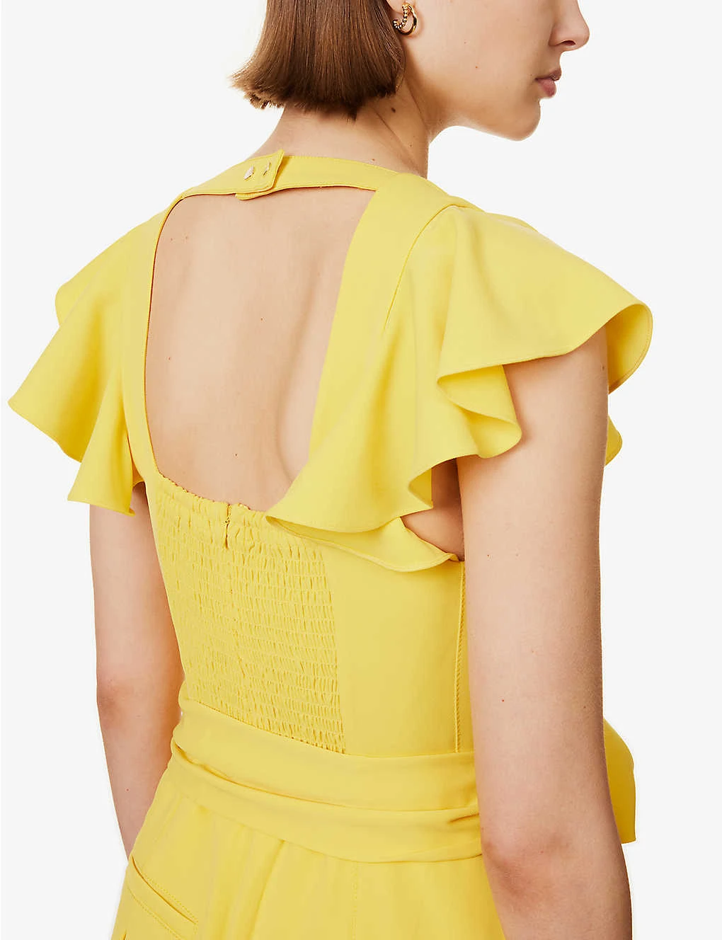 - Regular-fit, square neck, shoulder straps, frilled shoulder straps, darts at front, two slip pockets at front, pleated panels at front, self-tie belt at waist, wide leg, smocked panel at back, cut-out at back, gold-toned buttons