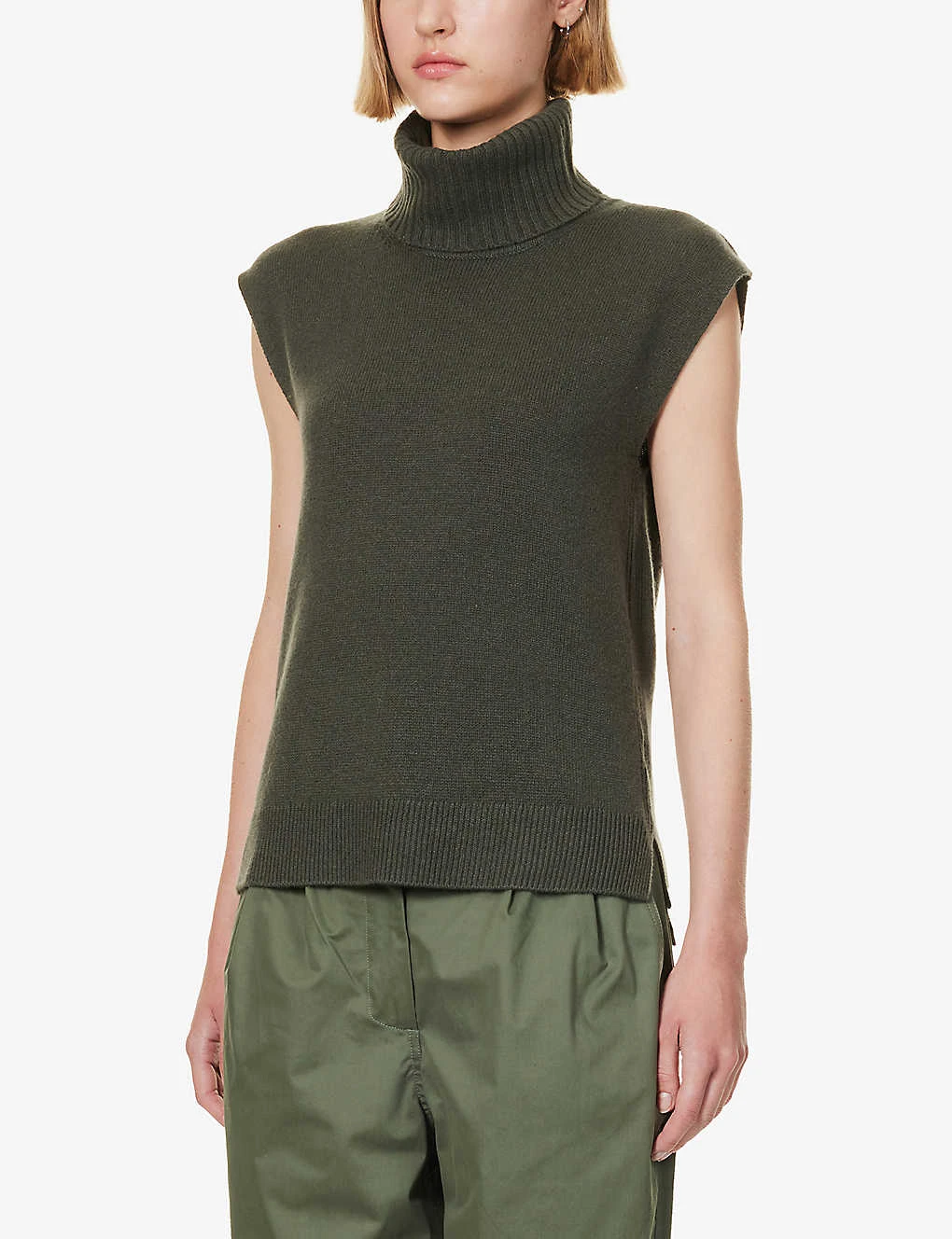 - Relaxed fit, round neck, detachable turtleneck, sleeveless, all over knitted and ribbed, split at sides, elasticated hem