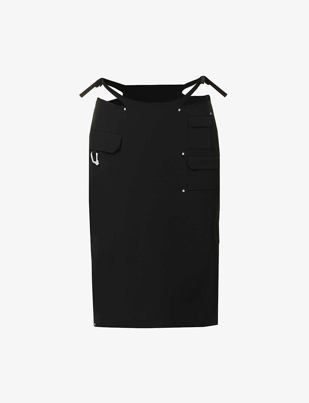 - Regular fit, mid-rise, self-tie at waist, three flap pockets at front, brand carabiner clip at front, darts at back, welt pocket at back, silver-toned hardware, split hem