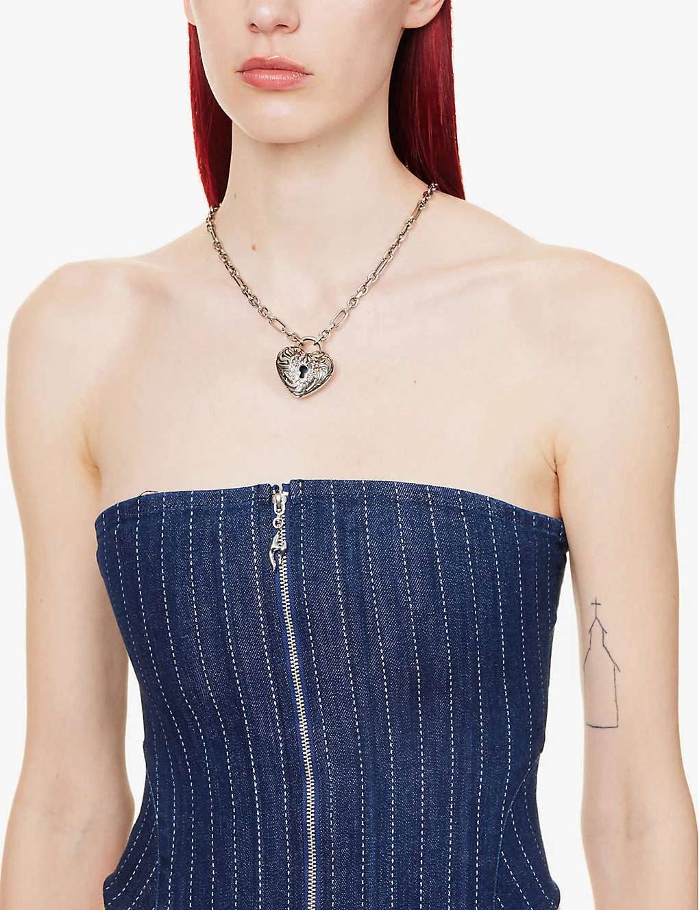 - Regular-fit, straight-across neck, strapless, all-over embroidered pin-stripe pattern, branded silver-toned hardware, curved hem