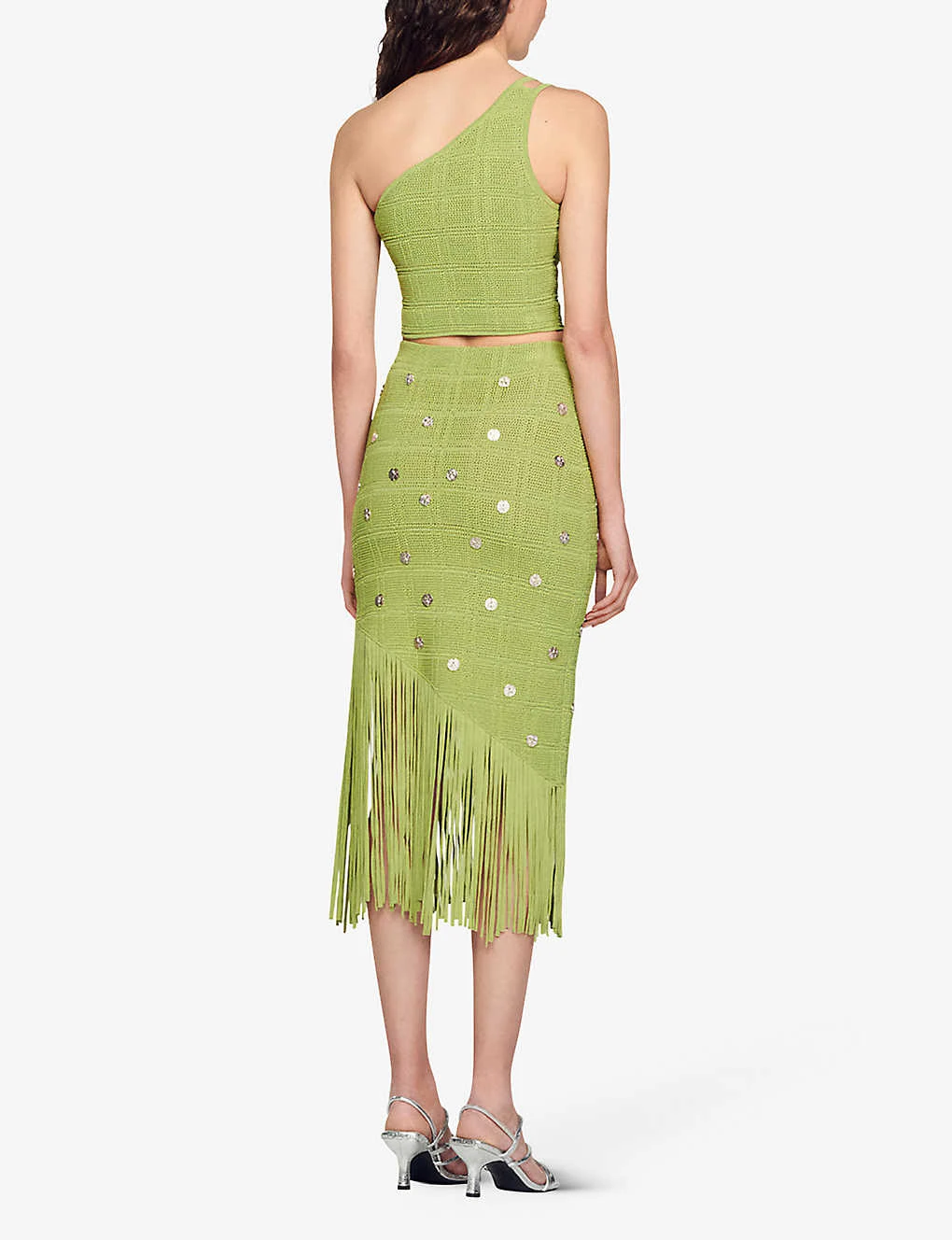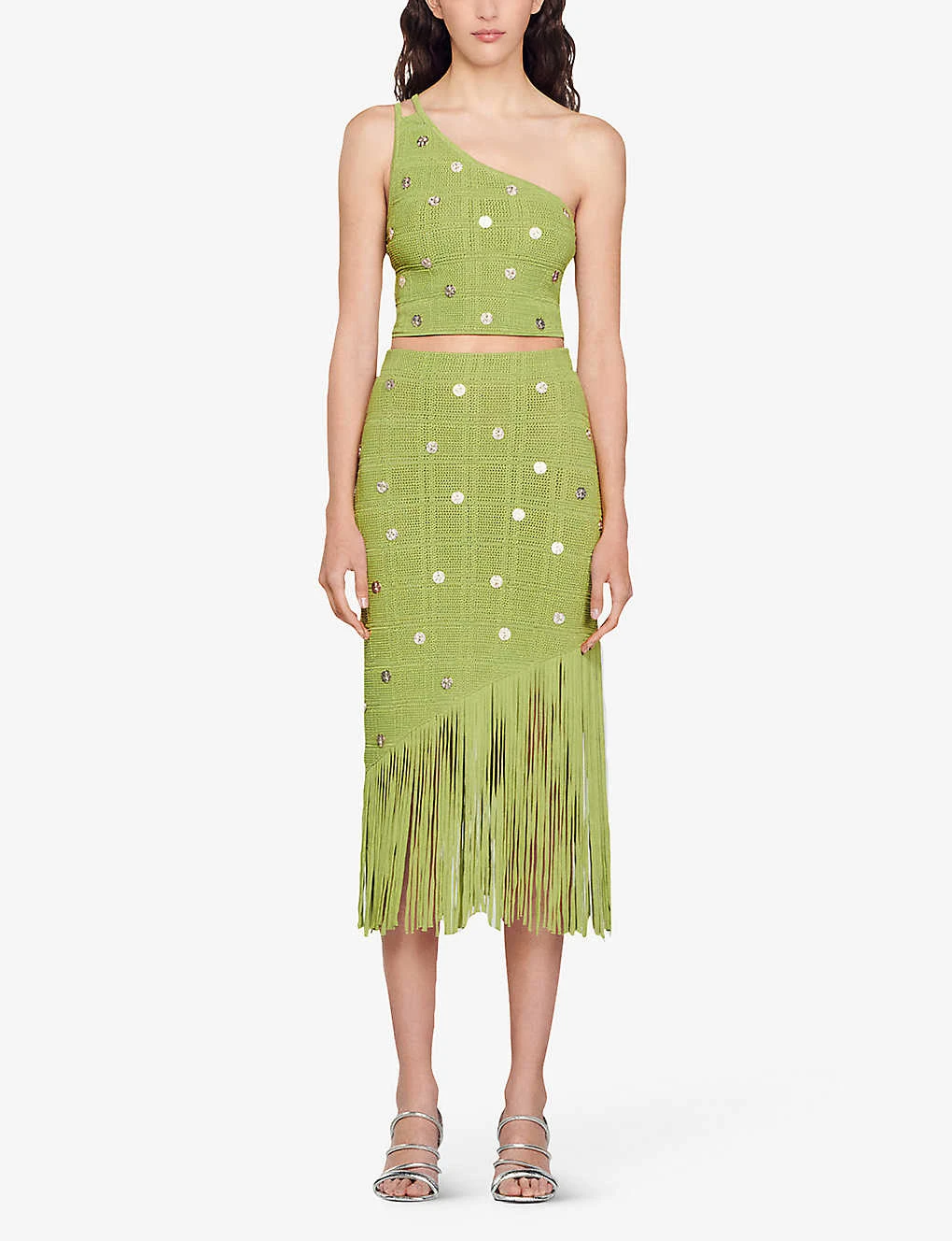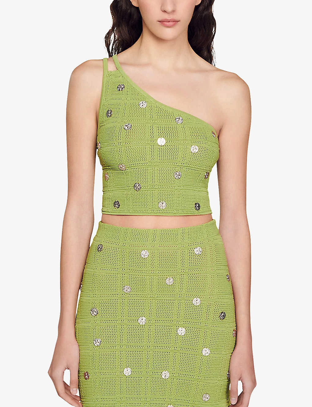 - Slim fit, one-shoulder design, cut-out detail, sequin embellishment, cropped
