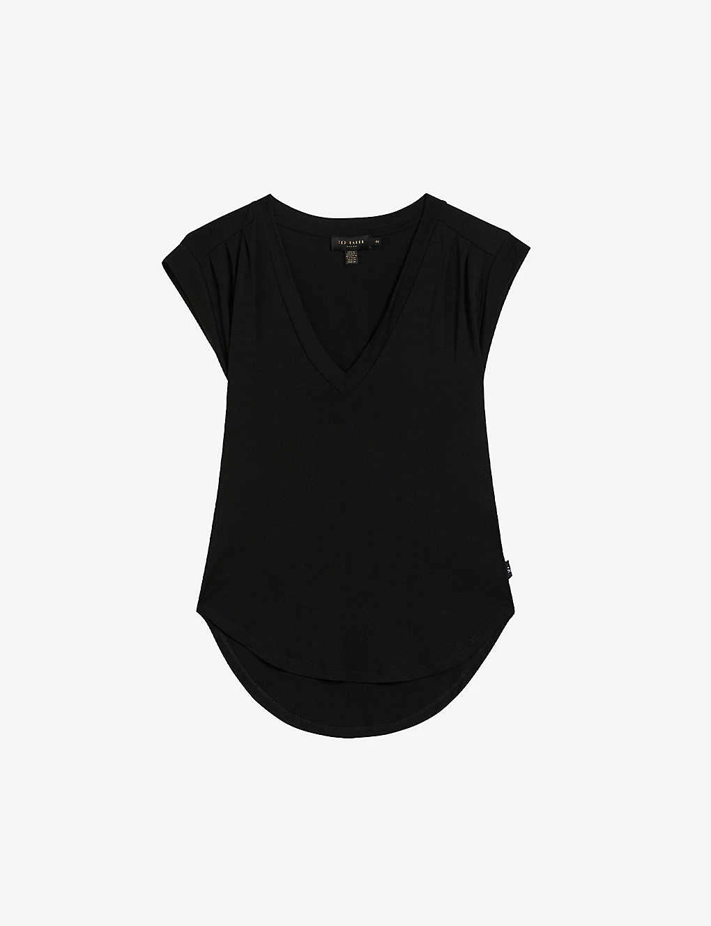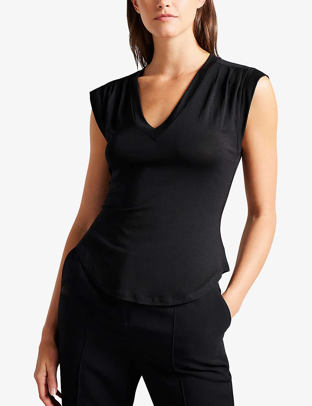- Slim fit, v-neck, cap sleeves, gathered panels at shoulders, brand tab at side, curved hem