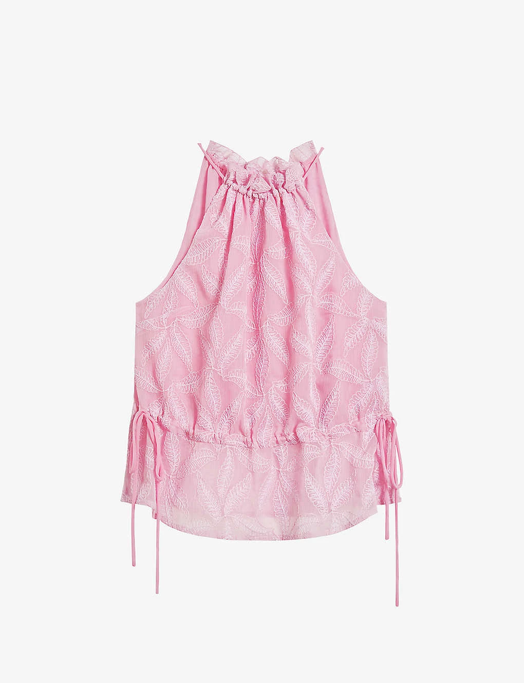 - Sleeveless, high frilled neck, drawstring halterneck, tie at the back, drawstring waist, peplum hem, all-over tonal botanical embroideries