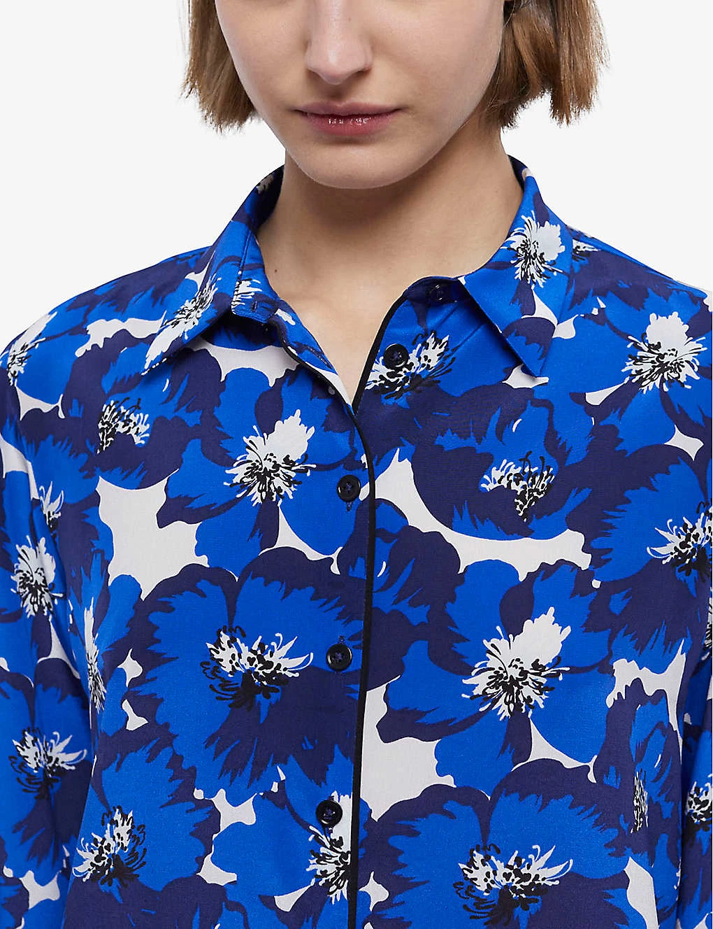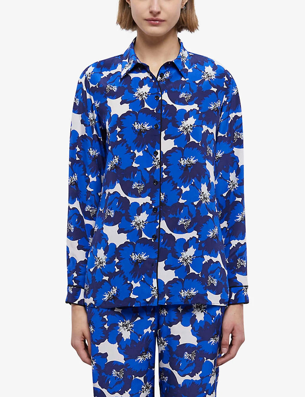- Straight cut, long sleeves, spread collar, all-over floral print, contrasting piped trim, button-through front, buttoned cuffs, straight hem