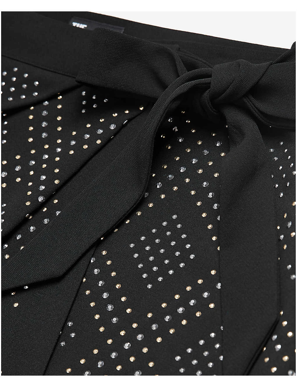 - Mid rise, rhinestone-embellished, mini silhouette, wrap front