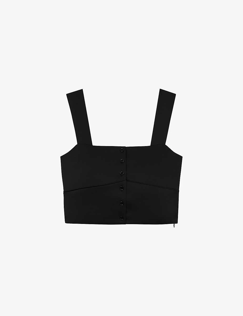 - Square-neck, sleeveless, button-down detail, cropped silhouette