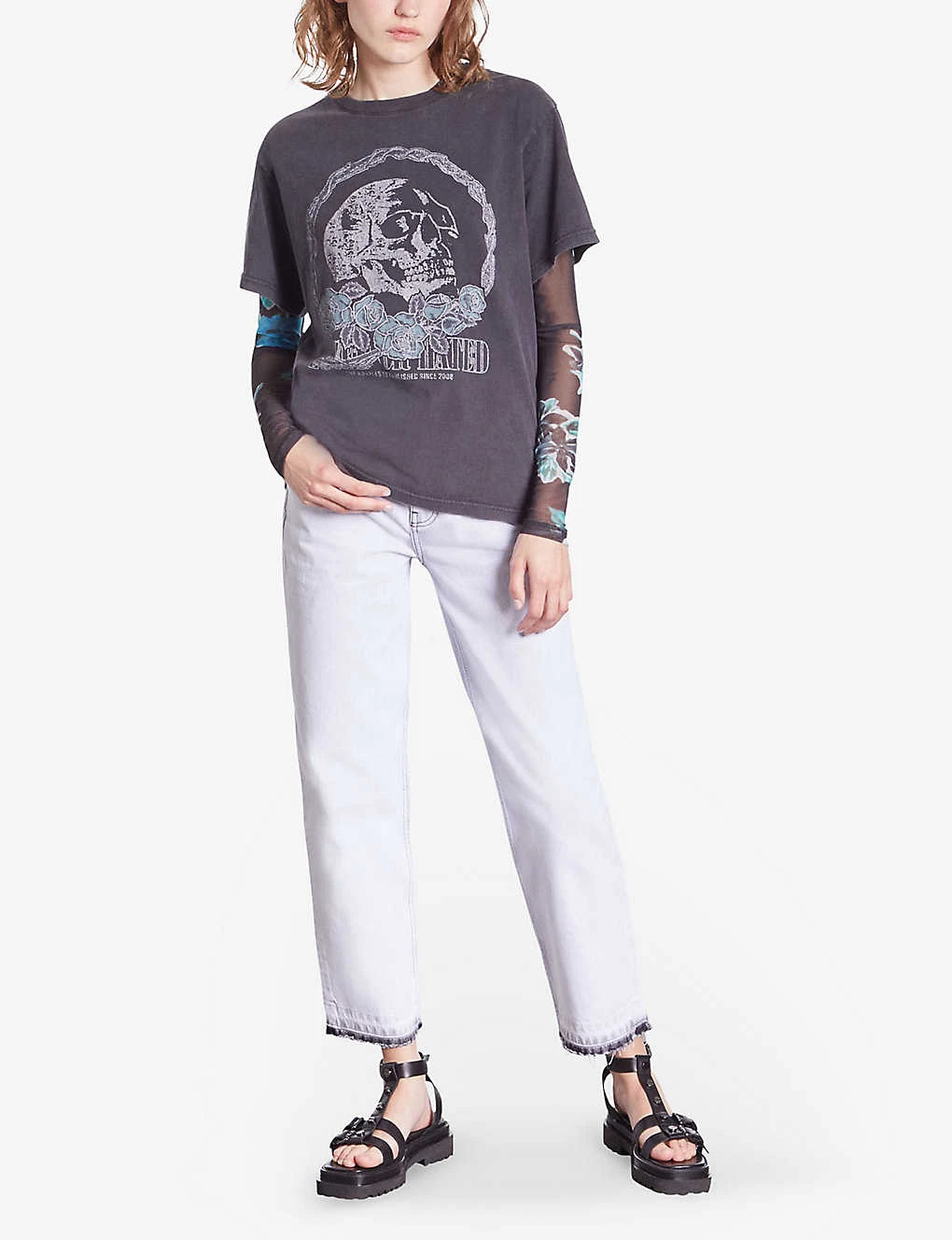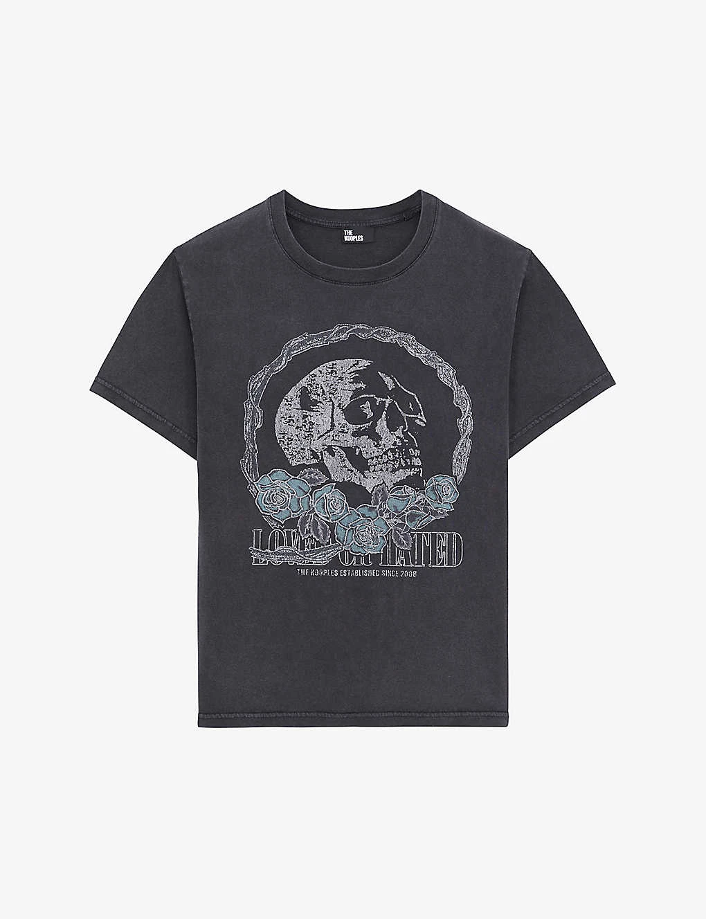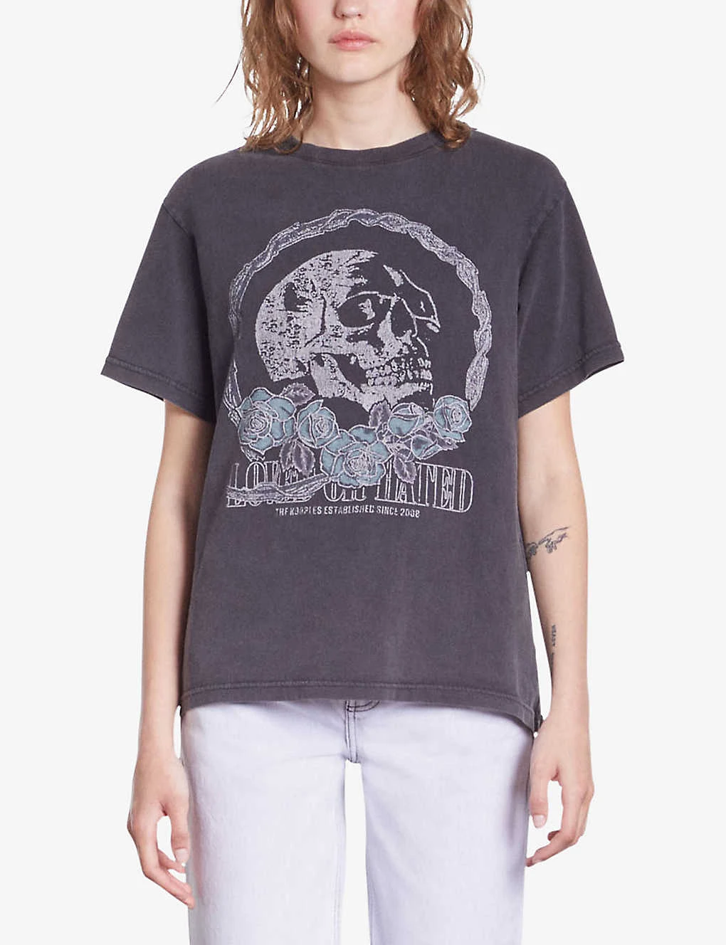 - Round neck, short sleeves, vintage-skull serigraphy at front, straight hem
