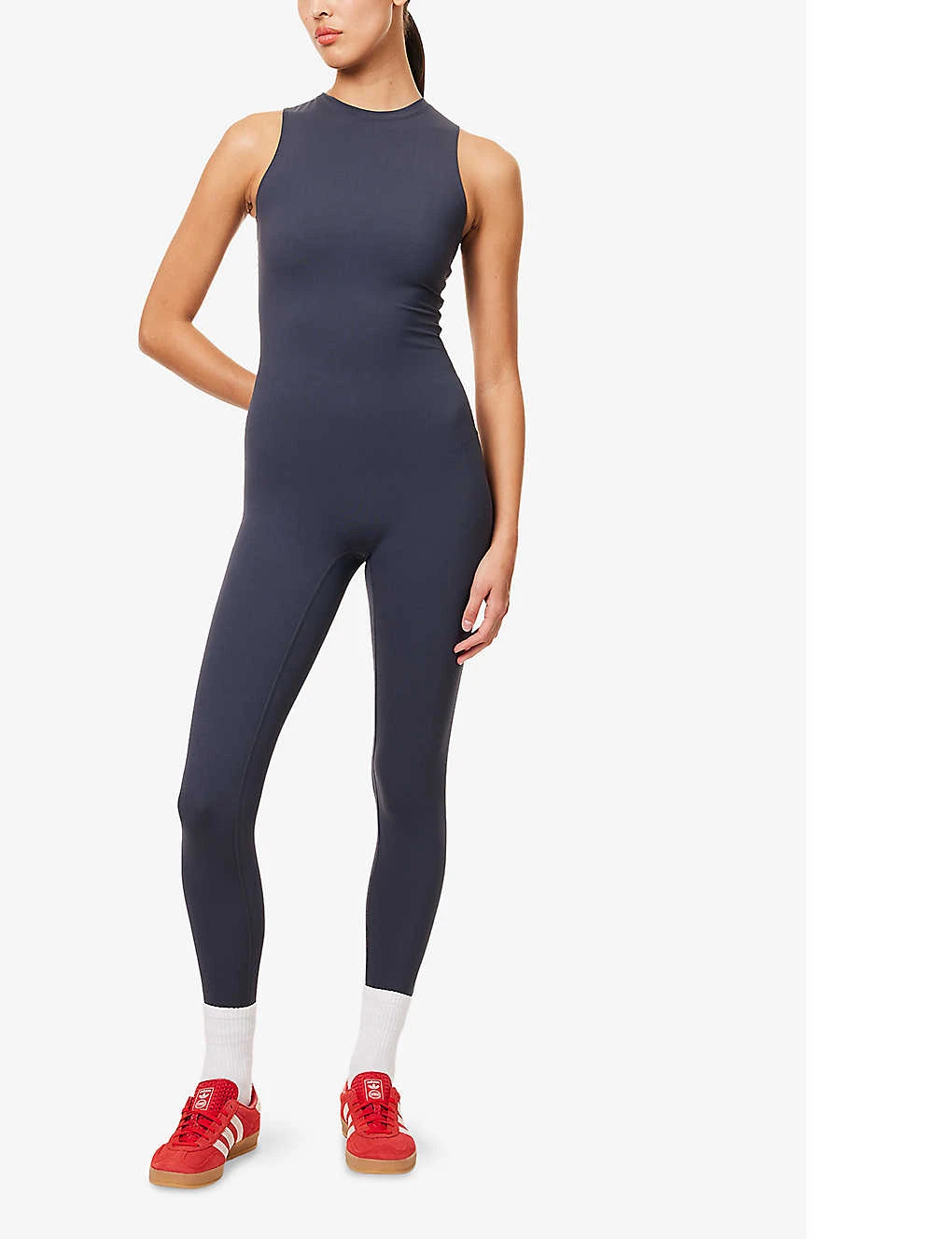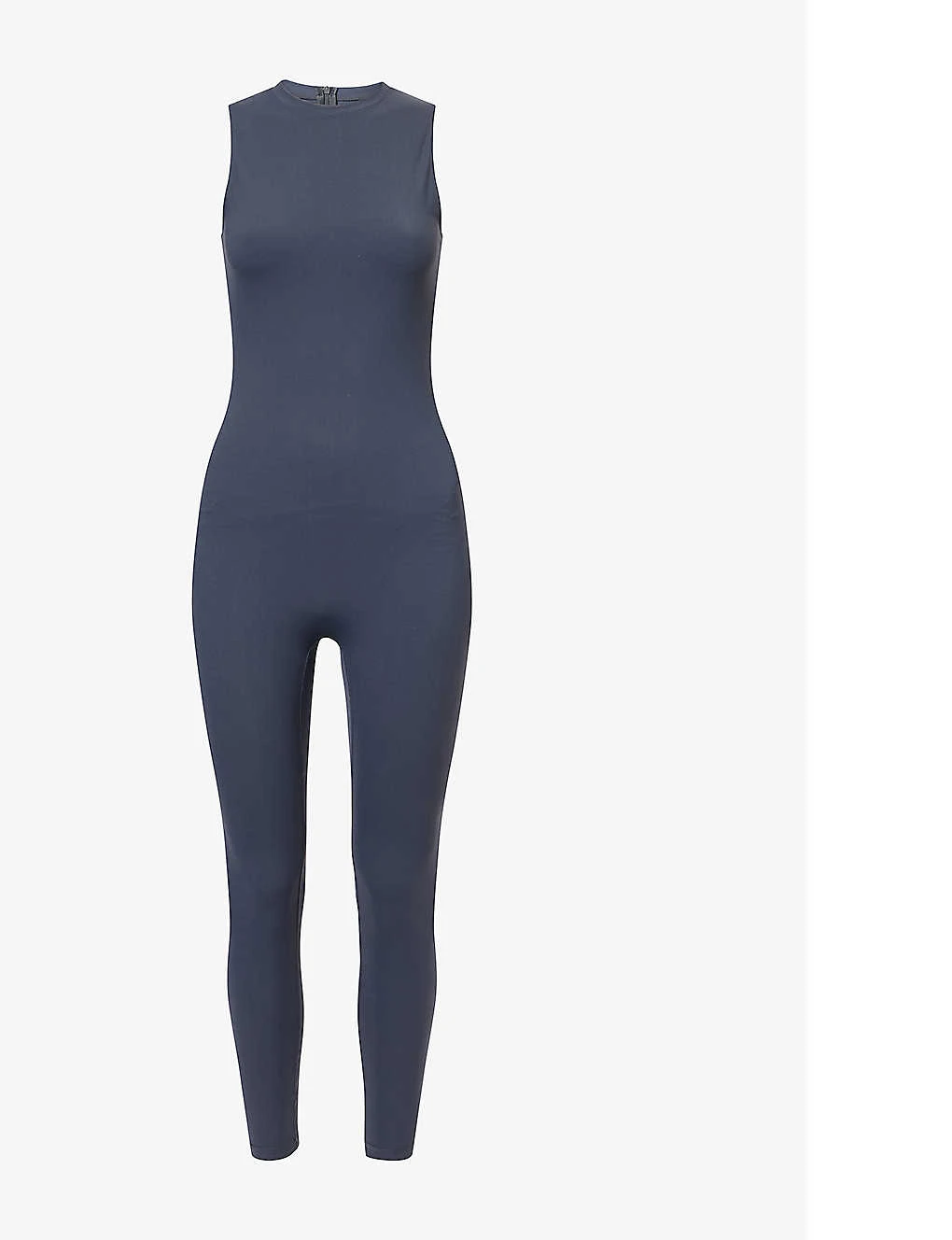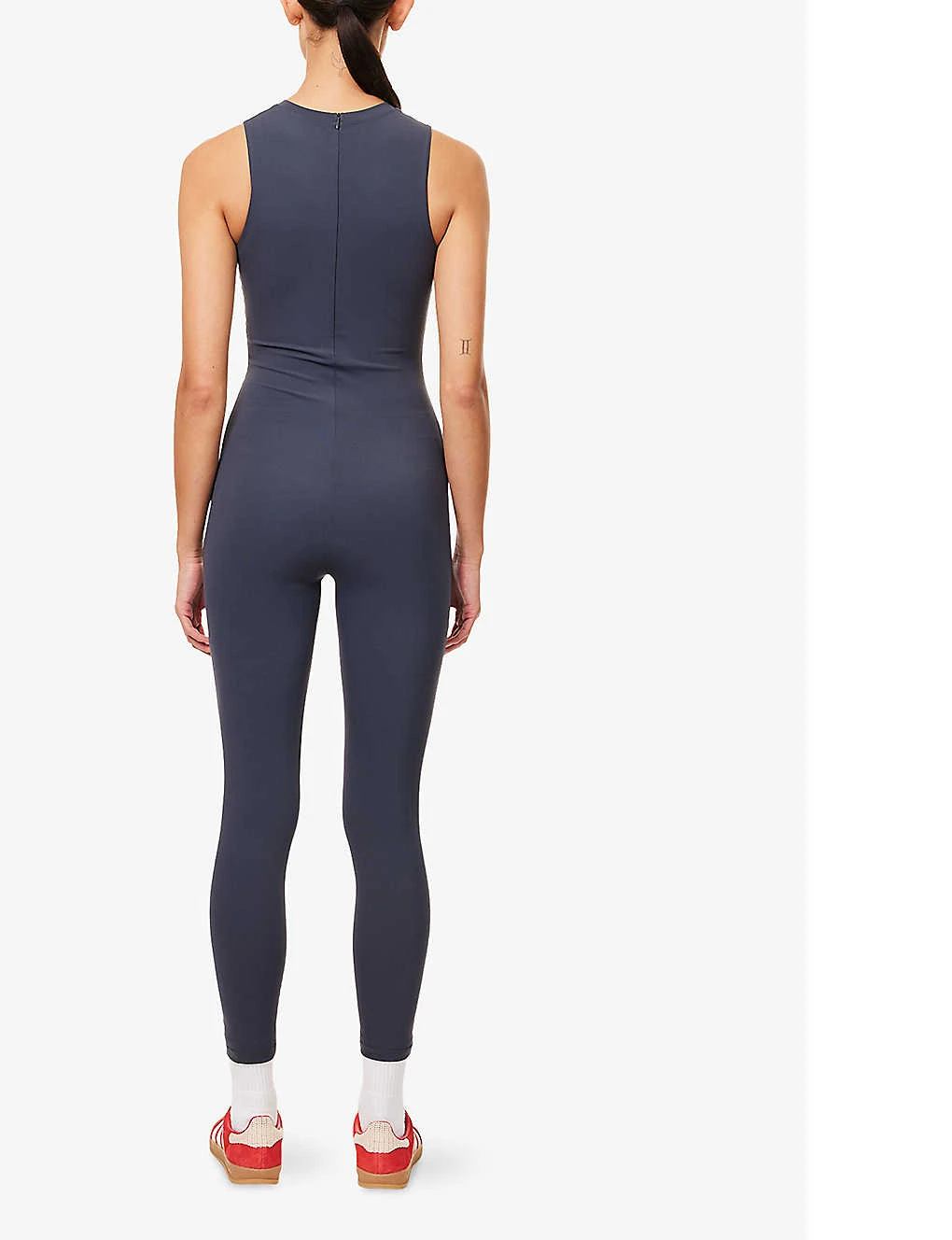 - Slim fit, round neckline, sleeveless, slim leg, exposed seam stitching