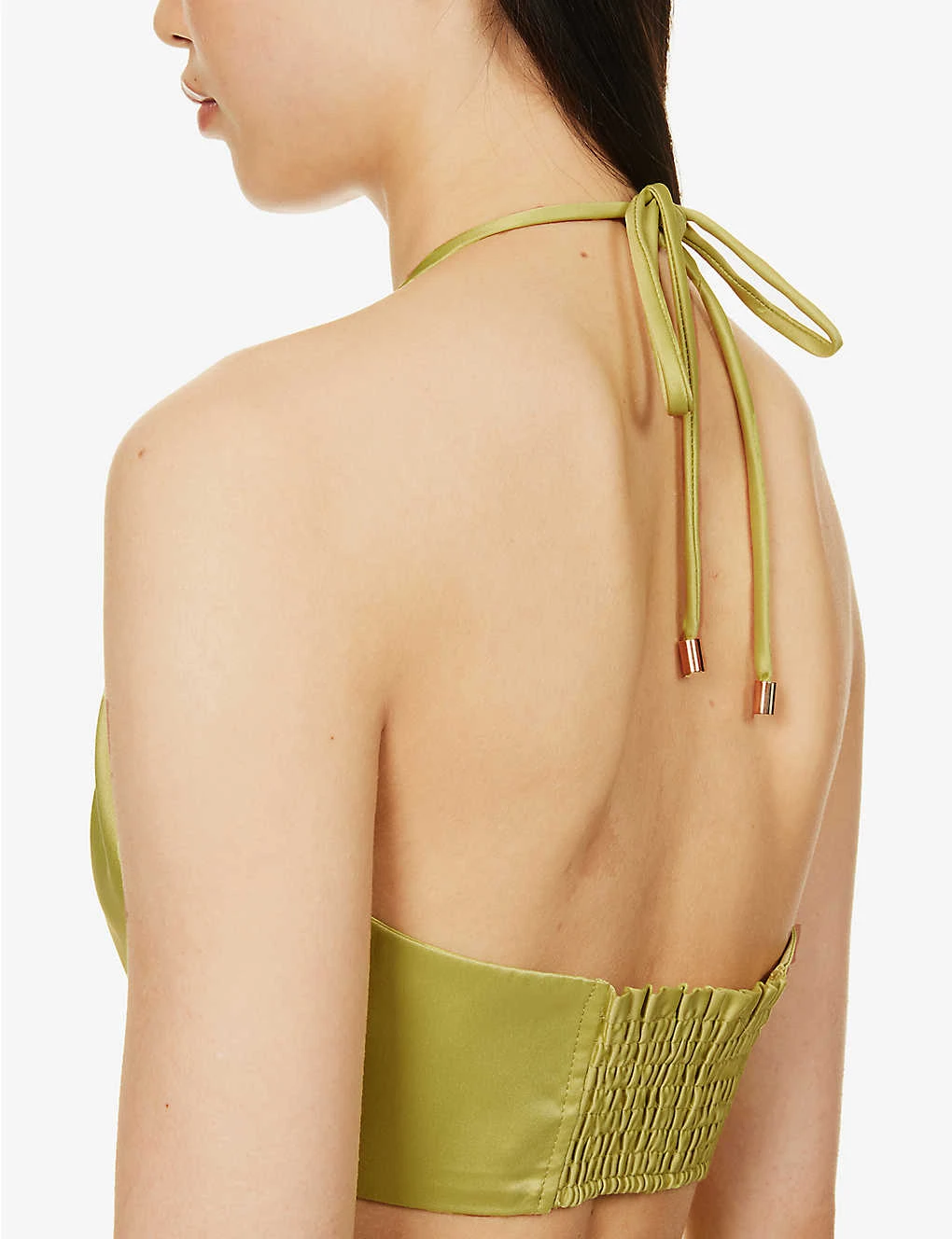 - Regular fit, plunge V-neckline, sleeveless, halter self-tie straps, shirred panel at back, cropped