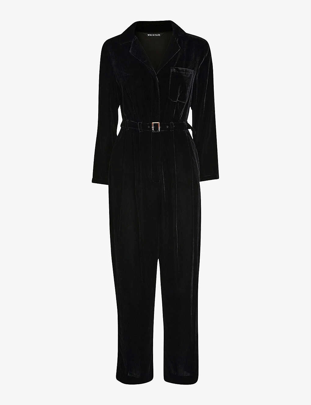 - Wide leg, long sleeves, button-through top, shirt-style collar, chest patch pocket, velvet fabrication, adjustable buckled belt